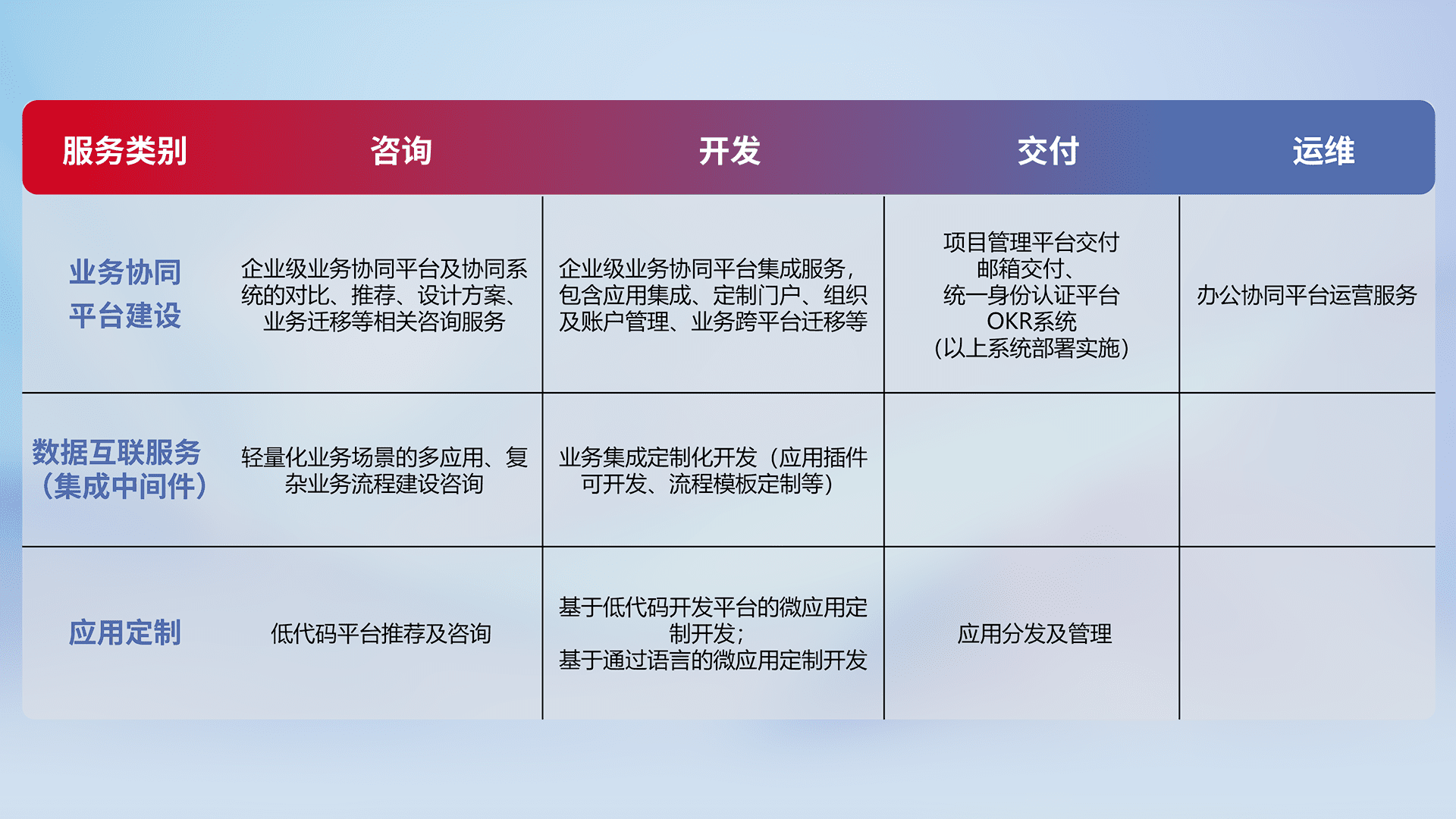针对钉钉、、企微、、IDaas等平台级产品提供产品的规划、、、方案、、交付、、、、定制化开发等服务,,实现如统一协同办公、、、、智能客户服务、、混合会议管理、、智能数据查询、、、、等业务场景,,,实现数字化转型。。。。