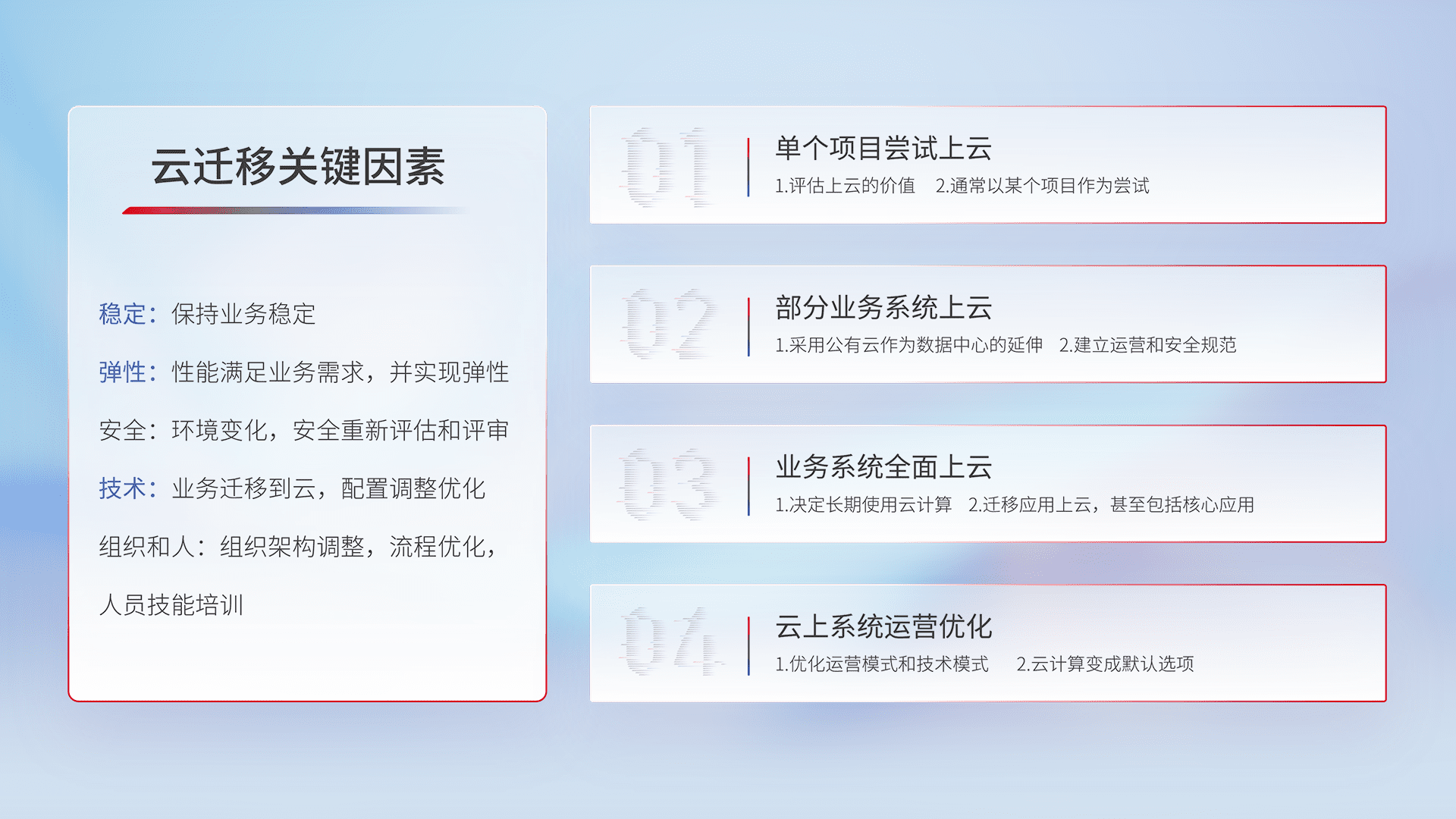 结合实际业务,,,从规划设计、、、、云平台选型、、云原生改造、、、数据迁移、、、、集成交付,,迁移全过程为客户识别最佳上云路径,,做好风险识别管理,,,设计网络架构、、身份权限、、、安全审计合规、、、、操作审计、、、、日志审计、、、、监控告警策略、、、、多站点容灾设计等,,,对云上基础设施进行整体规划,,,,提升IT治理水平,,以满足弹性、、、高可用、、高性能的需求。。。