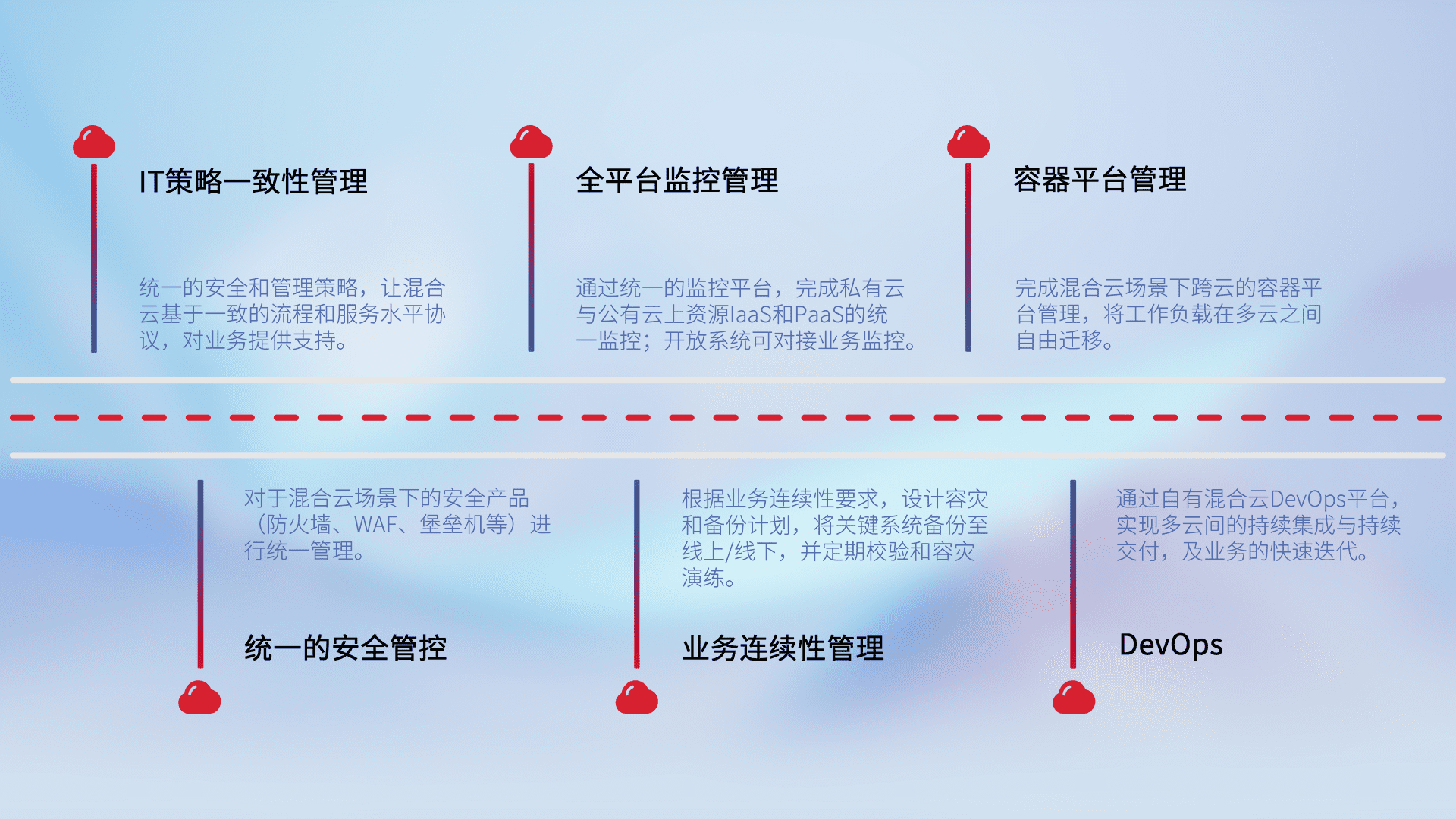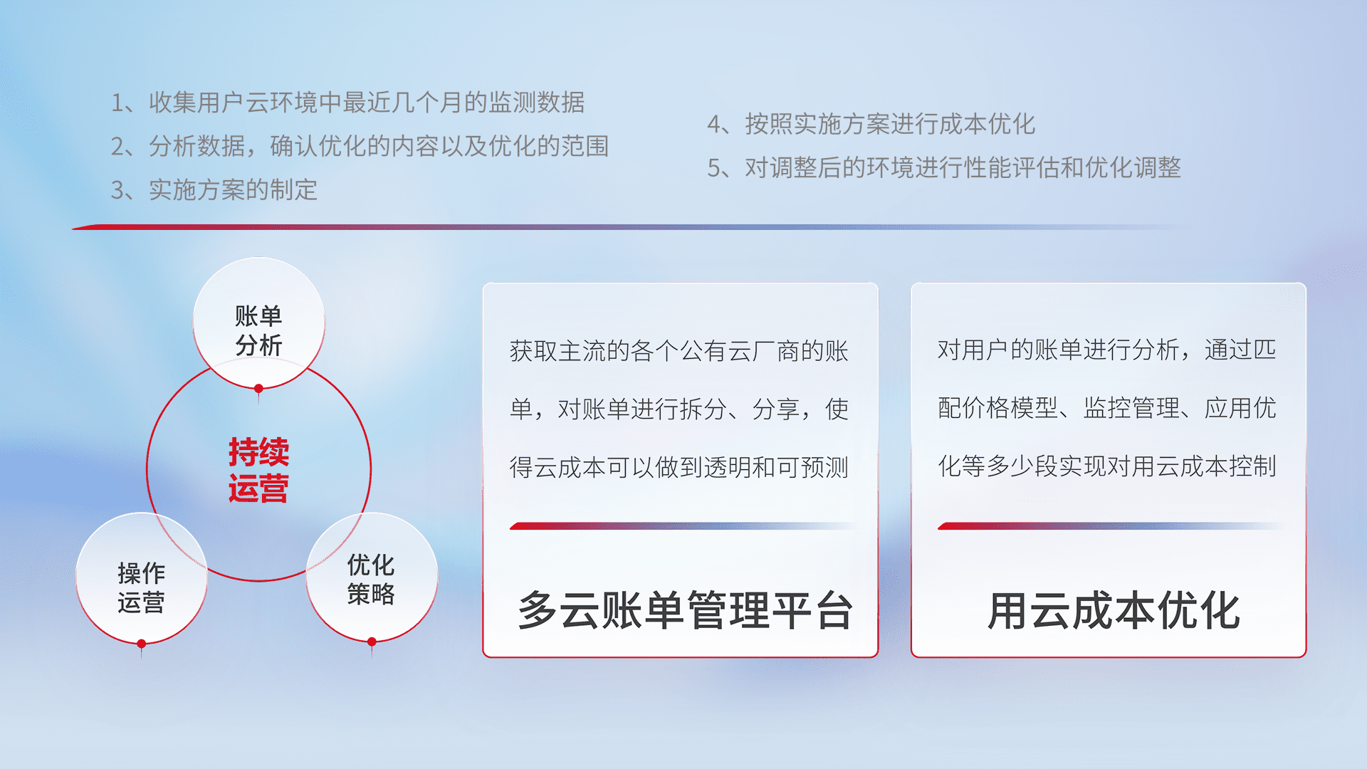 通过多云纳管,,,,以统一的资源数据模型把客户的云资源进行抽象和封装,,,,进而实现对多云资源的统一操作,,,保障云资源管理的可靠性、、稳定性与可用性。。。量身定制化运维内容,,配置、、、、开发运维、、、、补丁管理、、、备份、、监控、、认证和访问管理、、、、审计和日常巡检等,,保障在用云过程中的可靠度,,,,稳定度以及高可用率。。