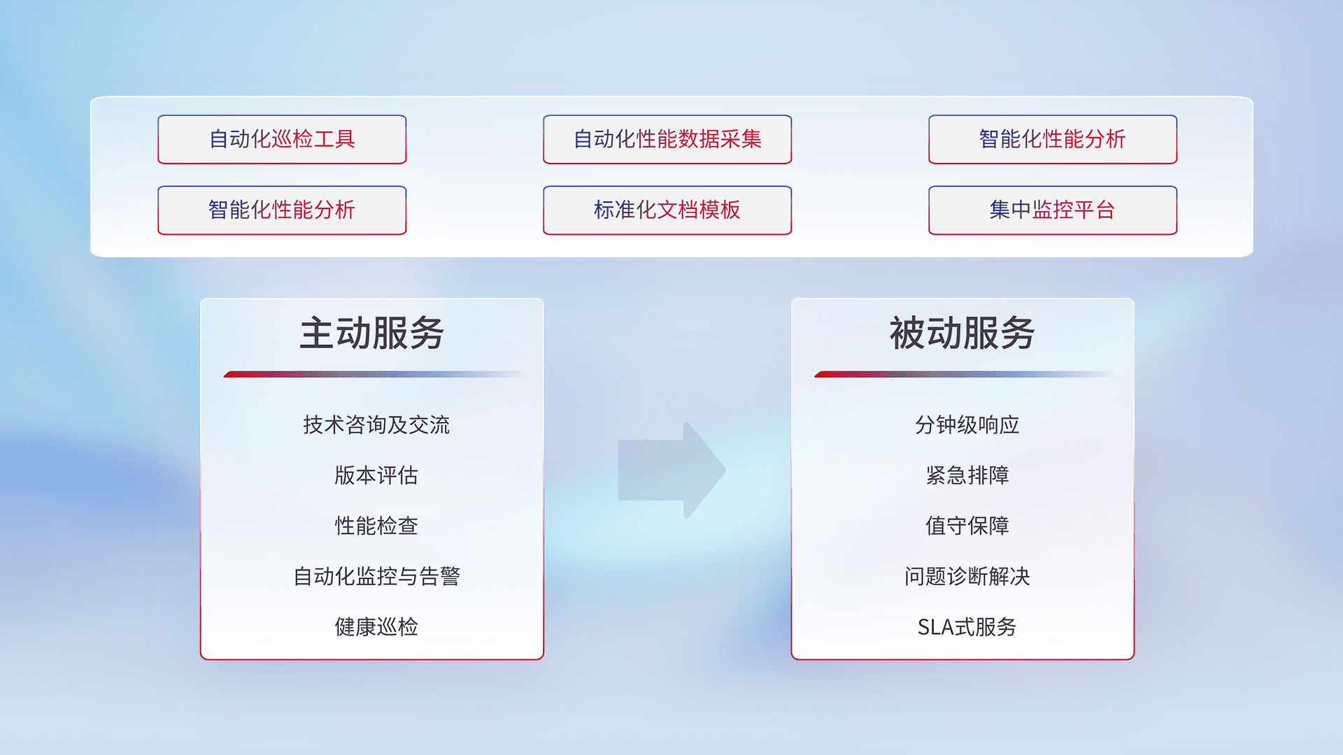 智能化工具和标准化文档,,,,保障服务质量,,提供主动服务(包含技术咨询、、版本评估、、、、性能检查、、、、自动化监控与告警、、、健康巡检)和被动服务包含(分钟级响应、、、、紧急排障、、值守保障、、、问题诊断解决、、、、SLA服务)。。